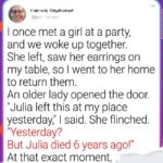When he knocked on the door, an older woman answered. He politely explained, “Julia left this at my place yesterday.” To his surprise, the woman flinched, her expression instantly changing. She looked at him as though he had just spoken something impossible. Then, with trembling lips, she whispered, “Yesterday? But Julia died six years ago.”